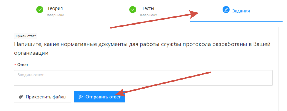 После обучающего материала и теств идет вкладка Задание, там есть поле для ответа. Здесь можно сразу писать ответ. Если он длинный, удобнее писать у себя на рабочем столе и сохранять ответы на домашние задания, а затем сюда скопировать. При необходимости можно добавлять файлы (фото, картинки и пр.).